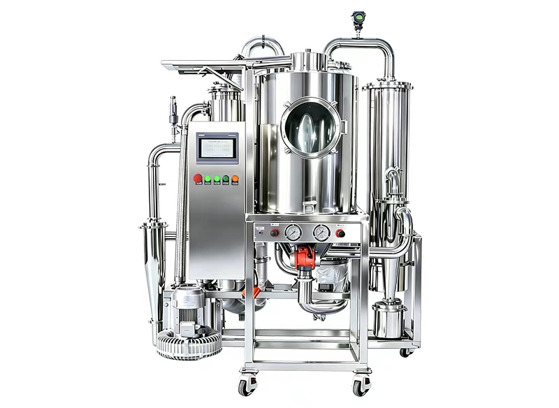 JA-BPG3L闭路循环喷雾干燥机解决了小型实验室款处理量不够,大机型占地面积大的问题,这款机器实现了两者兼容,这是一款针对有机溶剂,有毒或者有害的物料进行喷雾干燥的机型,物料中含有的有机溶剂浓度过高,易燃易爆或者物料宜氧化的的情况下,机器采用氮气替代干燥雾化系统的空气,氮气经过过滤装置,多级冷凝装置后循环密闭使用,从而保证实验过程中的安全性,也能保证样品不被氧化,完成干燥收集过程。